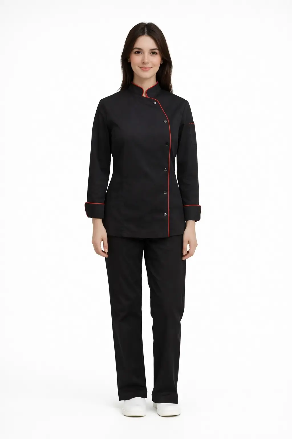 Ženska kuharska bluza s drukerima Chef namijenjena je profesionalnim kuhinjama gdje su urednost i funkcionalnost prioritet. Moderan kroj i kontrastni detalji daju joj prepoznatljiv i ozbiljan izgled.